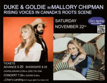 Duke & Goldie w/Mallory Chipman @Char's, Port Alberni Thursday November 20th 2025 doors 6:30pm start 7:30pm rising voices in Canada's roots scene